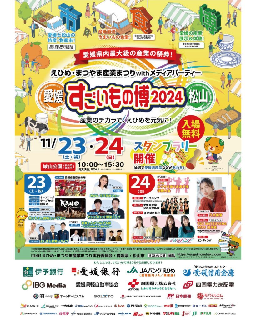 News & Topicsお知らせ・ニュースリリース Top > お知らせ・ニュースリリース 2024.10.29イベント 【イベント】11月23日(土) すごいもの博 2024年11月23日(土)に、城山公園で開催される「すごいもの博 2024」のステージに、KANO Allキャストが出演させていただきます。 ぜひ、遊びに来てください♪ 【日時】 2024年11月23日(土) 11時頃~ 【場所】 城山公園(松山市堀之内) 【出演者】 KANOキャスト全員